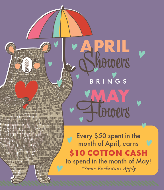 Every $50 spent in the month of April, earns $10 COTTON CASH to spend in the month of May! *Some exclusions apply.