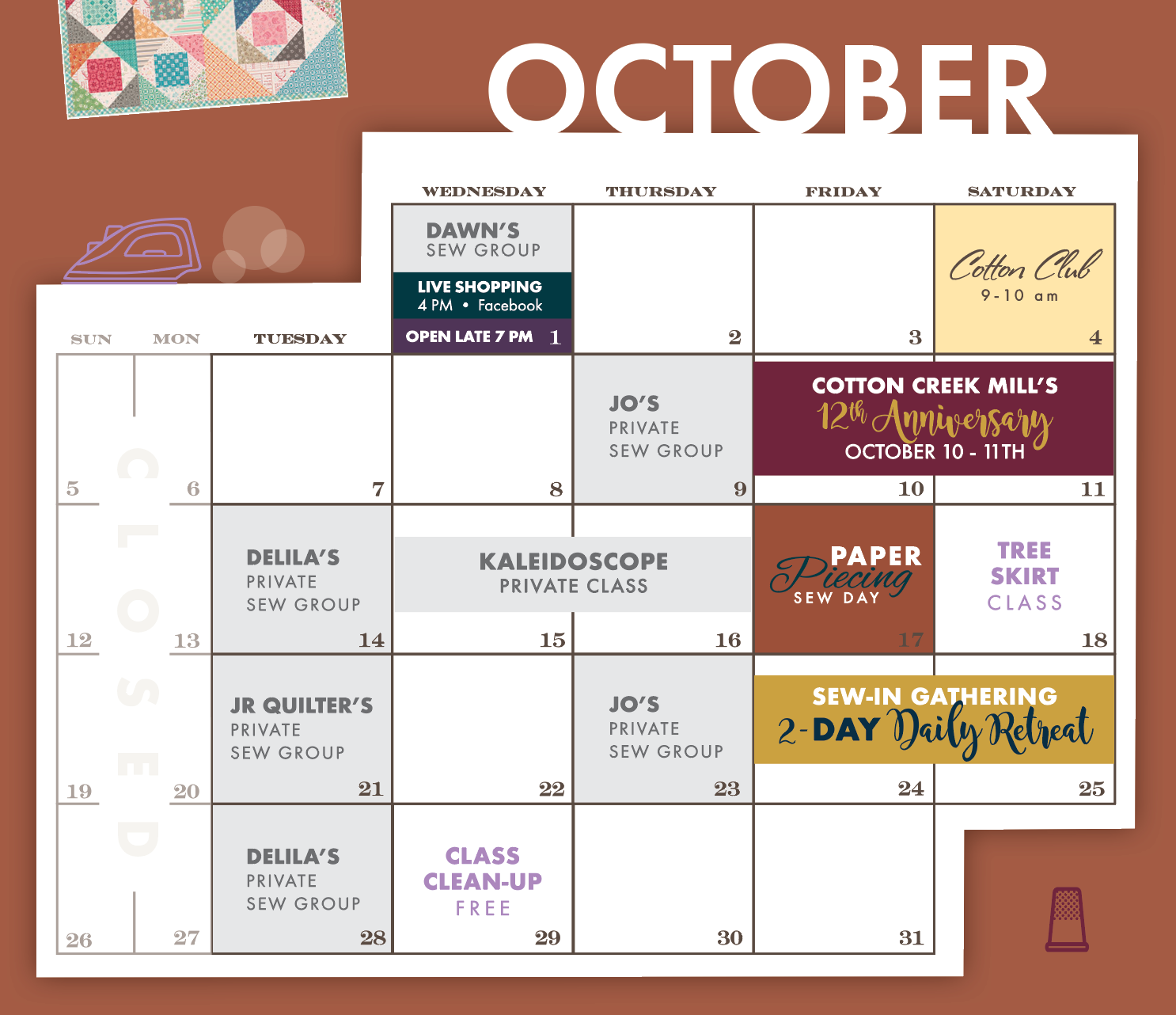 September 18 - 21st • West Liberty Community Center • $175 per person • 4 days of quilting & Homemade Meals!