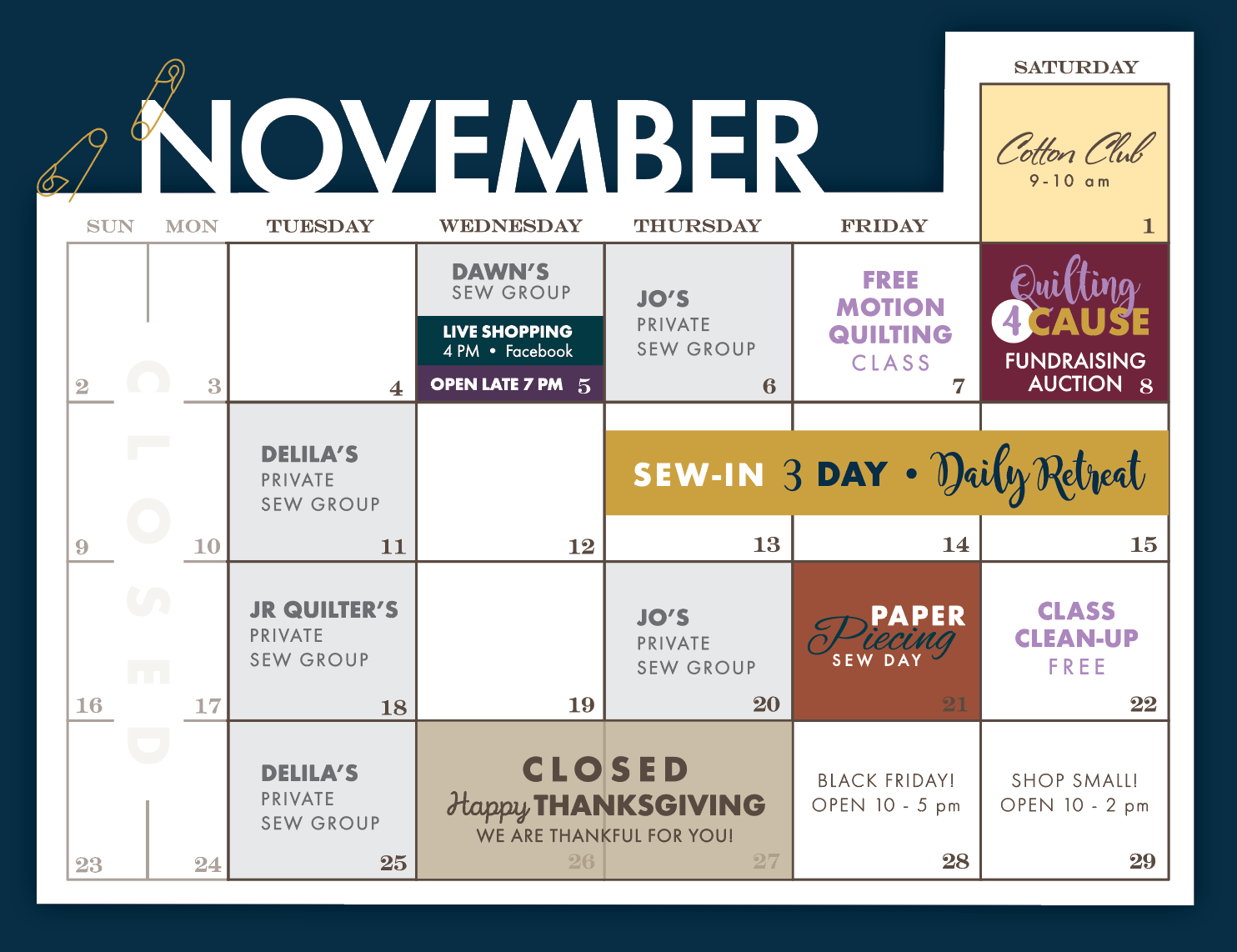 Join us this fall as we auction off store samples in an effort to find loving homes for quilt samples and support a deserving cause!